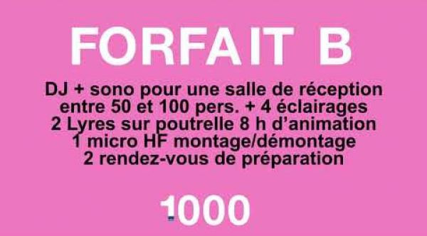 Découvrez nos formules tarifaires flexibles, conçues pour s'adapter à vos besoins et au nombre de vos invités. Chaque formule inclut du matériel de sonorisation et d’éclairage de haute qualité, ainsi qu'un DJ expérimenté. Personnalisez votre événemen...t avec nos options exclusives, telles que l’éclairage architectural, les machines à effets spéciaux et le bar à vinyles pour une expérience inoubliable.