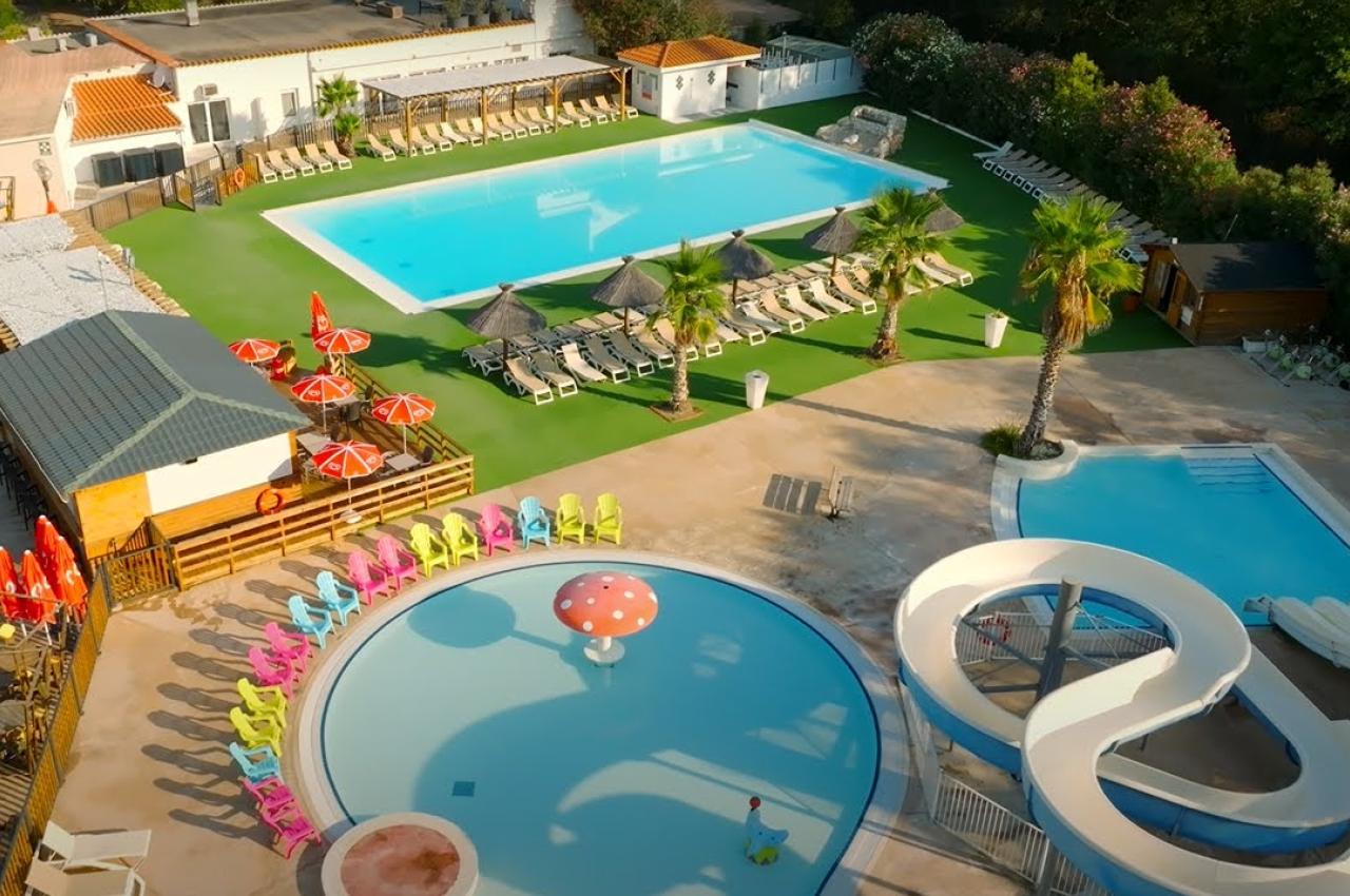Le camping offre un environnement fleuri avec une grande terrasse et une vue sur les bassins aquatiques, idéal pour des événements en plein air.