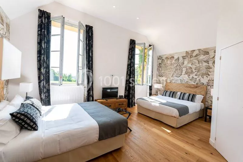 Hébergement sur place pour 28 personnes. Chambres de 2 personnes avec lit supplémentaire pour une 3ème personne. Plusieurs catégories : Confort - Prestige - Suite et Suite familiale (2 chambres indépendantes avec une grande salle de bains commune aux 2 chambres)