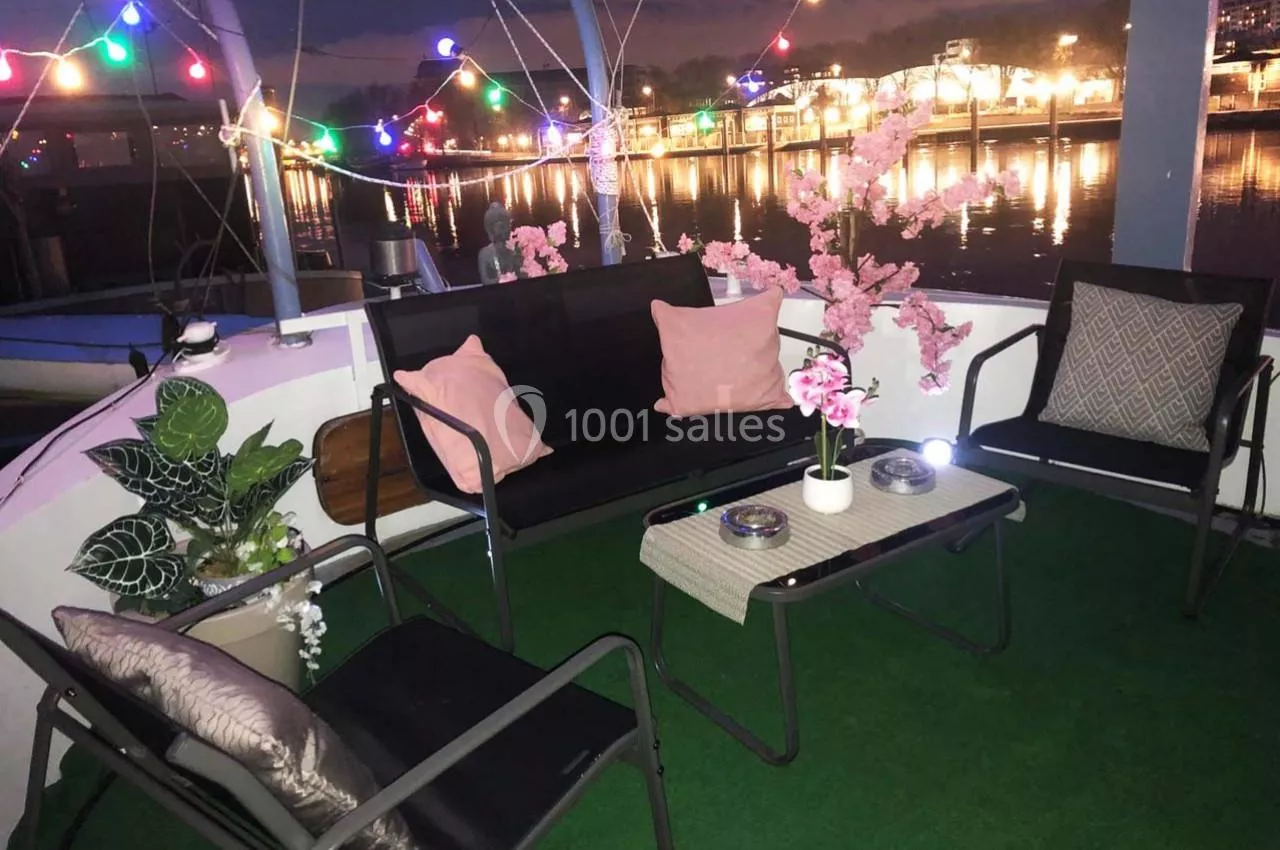 La péniche "So chic et son rooftop" offre une privatisation de tout l'espace sur 2 étages soit une superficie totale de 270 m2 pour une capacité d’accueil de 60 personnes max.