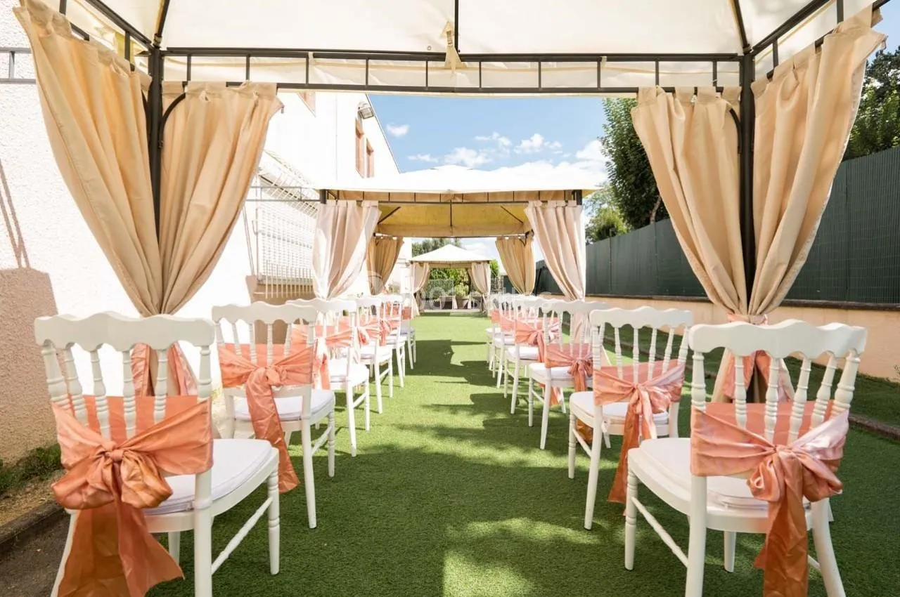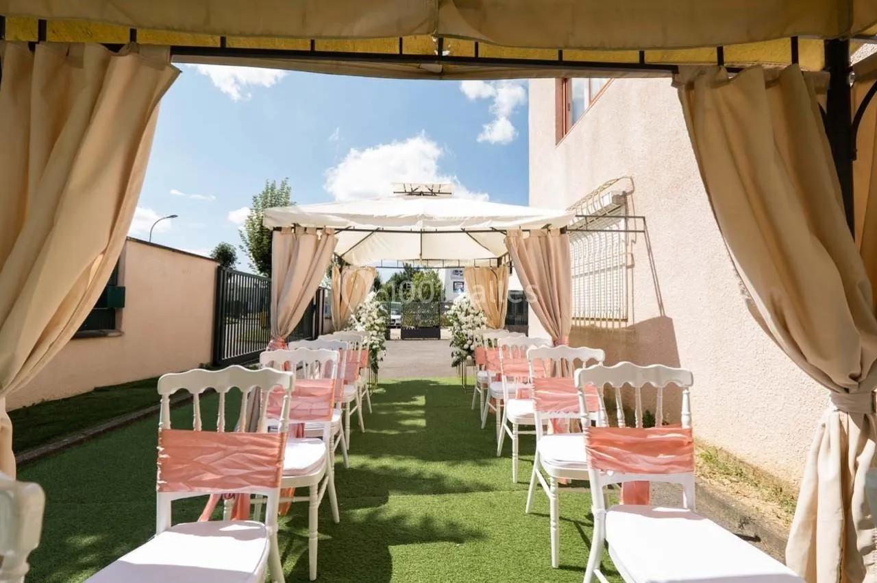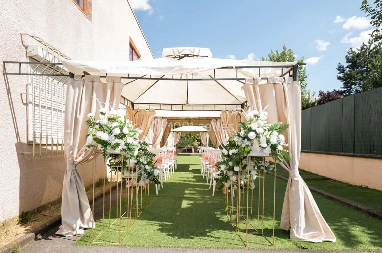 Oui, la salle dispose d'un espace extérieur avec une tonnelle, parfait pour les cocktails ou les cérémonies religieuses.