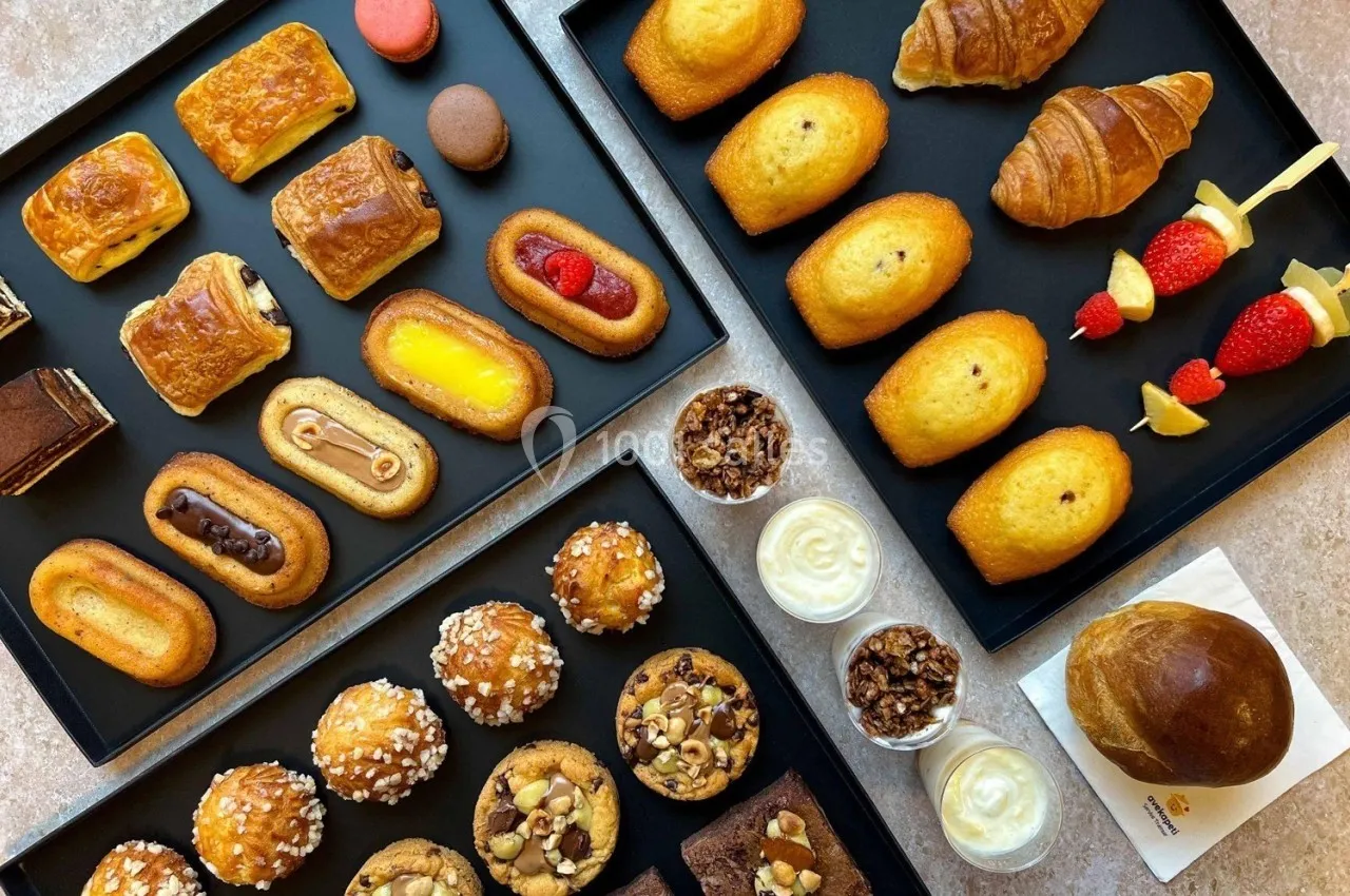 Petit-déjeuner gourmand : 1 mini croissant ou mini pain au chocolat ou mini pain aux raisins, 1 chouquette fourrée, 1 financier fourré ou verrine de fromage blanc au miel ou verrine de fromage blanc et granola - 4.50€ hors taxe / 4.95 TTC