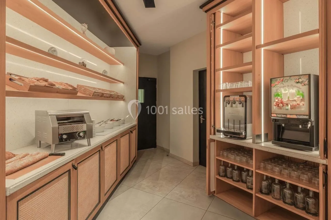 Les salles incluent des blocs-notes, stylos, eaux minérales plates et gazeuses, ainsi que du mobilier de réunion adapté aux besoins professionnels.
