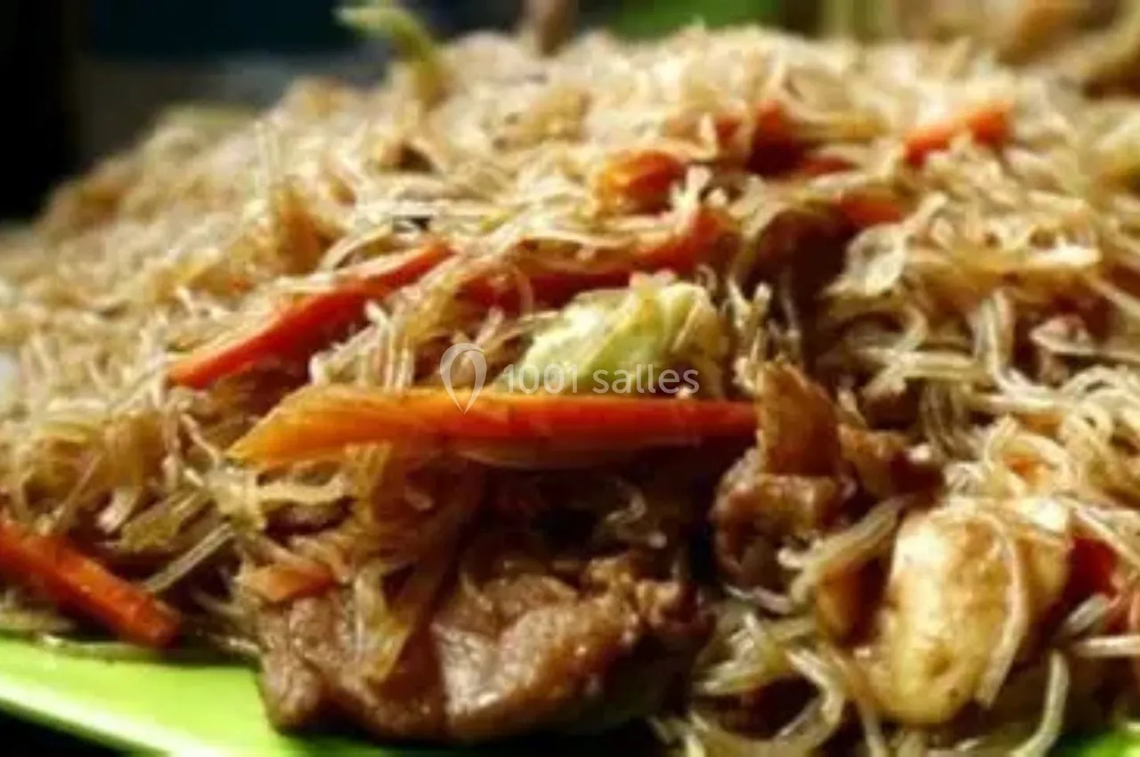 Bami – Vermicelles de riz sautés au poulet et légumes, accompagnés de riz.