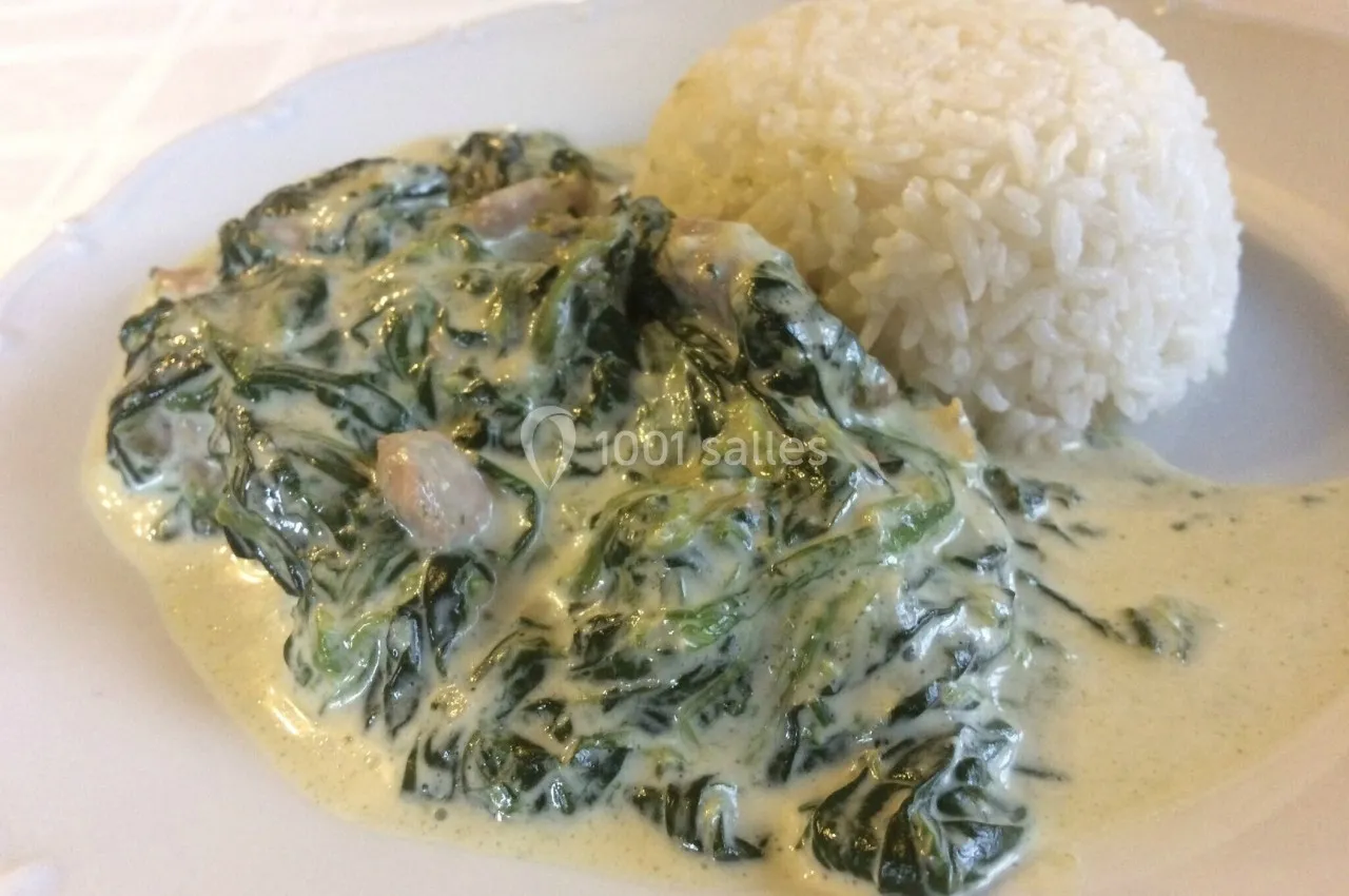 Poulet Fafa – Poulet mijoté au lait de coco et épinards, avec riz parfumé.