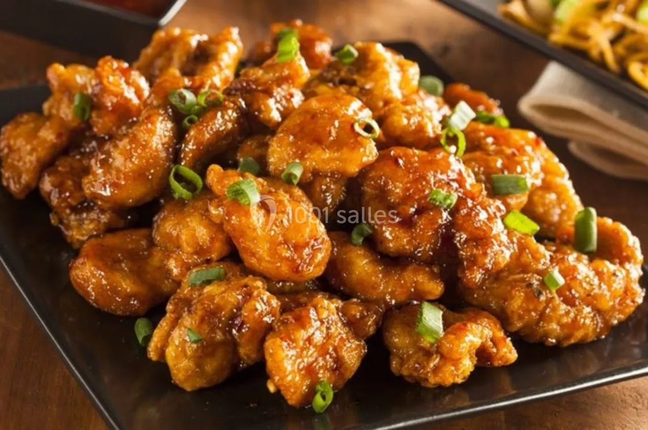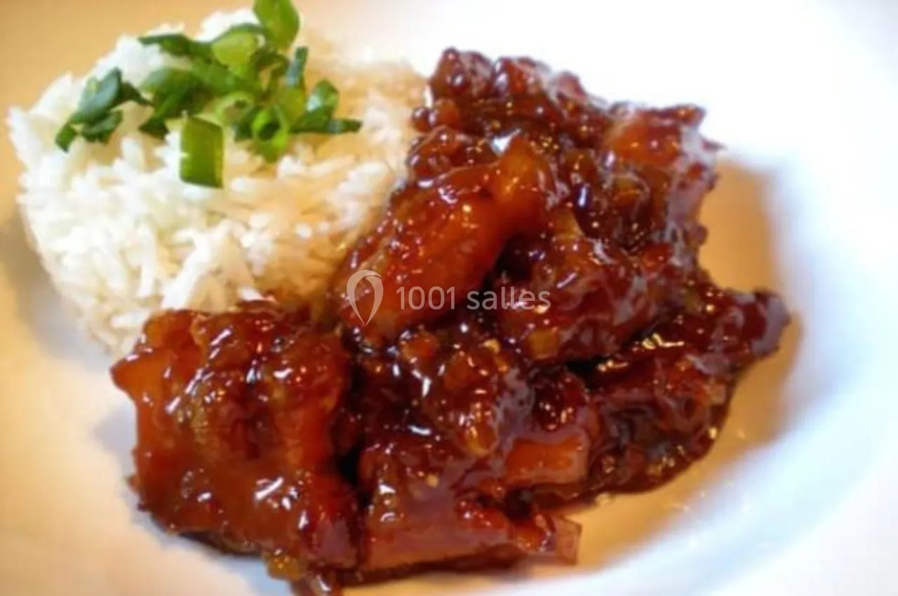 Porc Caramel – Filet mignon fondant, caramélisé au sucre roux et sauce soja, avec riz.