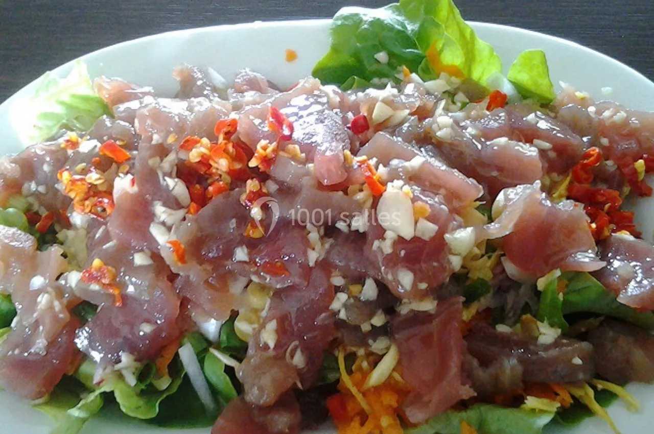 Salade Tahitienne – Thon rouge mariné au citron vert, légumes frais croquants, lait de coco.